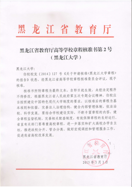 近日,《黑龙江大学章程》经黑龙江省高等学校章程核准委员会评议,由省教育厅核准生效,标志着黑龙江大学开启了依法治校、科学发展征程的新篇章。