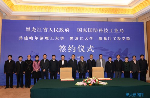 4月17日下午,黑龙江省人民政府与国家国防科技工业局共建哈尔滨理工大学、黑龙江大学、黑龙江工程学院协议签约仪式在哈尔滨举行。省长陆昊,工业和信息化部党组副书记、副部长、国防科工局局长许达哲出席签约仪式,副省长胡亚枫、国防科工局副局长徐占斌代表双方签署共建协议并致辞。我校校长何颖、副校长付宏刚,科学技术处、化学化工与材料学院、电子工程学院有关负责人参加仪式。