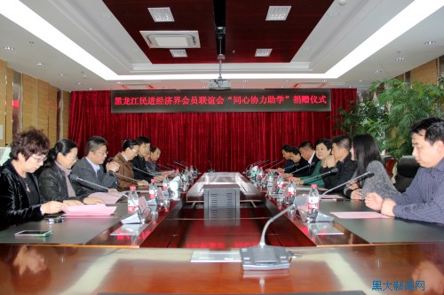 本次“同心协力助学”捐赠活动是民进省委为贯彻落实我省关于在全省统战系统开展“同心协力活动”所开展的,也是黑龙江民进经济界联谊会自2014年1月成立以来,在民进省委领导下开展的一次大型捐赠活动。本次捐助已经是民进省委第二次来我校捐赠,之前在2012年11月,珍宝岛药业董事长方同华向学校教育发展基金会捐赠助学基金。(摄影:张朔铭)