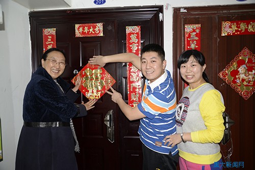 何颖校长的到来使大家倍受鼓舞。刘书刚老师自英国留学归来后在校任教多年,其事必躬亲的学术态度、注重实践的教学风格在学生中享有良好口碑与威望,他表示是黑龙江大学给了自己发展事业、实现价值的广阔空间。霍明琨老师不仅是国家级精品视频公开课的授课教师,龙江文化名人,更是学生的良师益友,她谈到“教师只有站在讲台上才能真正体会到幸福”时,充满了令人动容的深情和力量。校本科教学示范奖获得者祝洪章、贾茹、王磊三位青年教师则表现出不约而同的坦率,“没想到校长亲自来慰问”,“兴奋得睡不着”……不过他们也认为,这份特别的荣誉和祝福是对所有青年教师最大的认可和最好的鼓励。贾茹的爱人李彤系我校艺术学院教师,小两口笑着对何校长一行说,黑大赋予他们的不仅是值得奉献一生的事业,还有将要呵护一生的爱情。临行前,何校长为这个幸福的小家贴上了象征吉庆和祝福的新春福字。