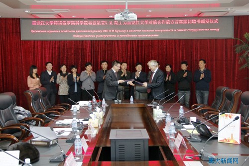 布兹尼克V.M院士表示非常荣幸能够成为黑龙江大学对俄合作俄方首席顾问,他回顾了多年来与我校的合作经历,并指出将在新的发展阶段探索新的合作方式、方法,竭尽全力为促进黑龙江大学发展、深化中俄战略协作、增进两国人民友谊做出应有贡献。