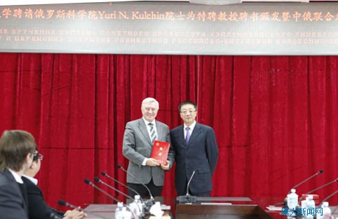 11月13日上午,我校聘请俄罗斯科学院Yuri N.kulchin院士为特聘教授暨中俄联合光纤技术实验室揭牌仪式在党委会议室举行。俄罗斯科学院远东分院副院长Yuri N.kulchin院士,俄罗斯科学院光纤传感专家Anton、Oleg Vitrik,我校客座教授、大连理工大学周智,我校客座教授、哈尔滨工业大学李俊庆出席了本次仪式。我校校长张政文,副校长闫鹏飞及人事处、科学技术处、电子工程学院相关单位负责人参加了仪式。仪式由闫鹏飞副校长主持。