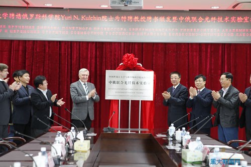 张政文校长为Yuri N.kulchin院士颁发特聘教授证书,并共同为中俄联合光纤技术实验室揭牌。