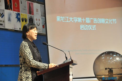 主持人首先介绍了此次广告创意文化节的活动背景以及主要内容,随后新闻传播学院院长郑亚楠教授代表主办方致辞。在回忆了广告节的十年历程后,郑亚楠教授强调,正是梦想快乐与成长、学生专业养成平台、创意创新这些核心要素,让“黑大广告节”得以在举办十年之际依然迸发着青春与活力。此外她对广告系的复合型人才培养模式进行阐释并予以肯定,对即将参与到广告节中的学生提出了希望。最后,郑亚楠教授介绍了本届广告节的两大亮点,其一加入了非专业组比赛单元,让全校同学为学校创意宣传语,并以校园公益理念为核心为学校创作公益广播广告脚本;二是针对业界用人单位对广告创意、策划人才的需求,本届广告节将举办广告学专业专场招聘会,搭建学界与业界联系的平台,为2009级广告学专业学生提供就业机会。