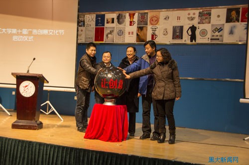 副校长何颖按下启动引擎,宣布黑龙江大学第十届广告创意文化节正式启动