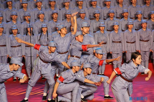 从革命圣地延安开始,“红色记忆”向我们娓娓道来学校的发展历程。从中国抗日军政大学第三分校俄文大队到哈尔滨外国语学院,再到今天我省历史上第一所综合性大学——黑龙江大学,期间的岁月,让每一位黑大人都难以忘怀。一曲曲红歌合唱,歌颂着我党克服万难走向胜利的辉煌岁月,也传颂着学校紧跟党的步伐,为国家输送人才的光荣历史。情景合唱《民族的召唤》重现了抗大的红色历史,触动了黑大人对母校的温暖回忆。激昂的舞蹈《红旗颂》和军乐团动作整齐划一的《中国人民解放军进行曲》讲述了建国后,我校在崭新的历史节点上,与祖国同呼吸、共命运的发展历程。歌舞《回延安》讲述了我校艰苦创业、励精图治、开拓创新的奋斗历程。壮烈鲜艳的红色,让我们铭记历史的责任,感受革命精神传承的力量,更昭示着我校以省部共建为契机迈向美好明天的壮志豪情。