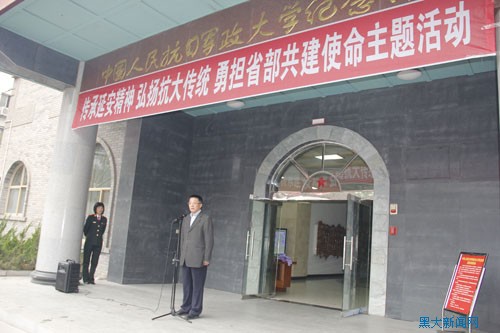 张政文校长在讲话中说,值此黑龙江大学获批成为省部共建高等学校之际,代表团一行18人回到延安,回到学校当年诞生的地方,是为了要牢记黑龙江大学是一所拥有光荣历史的学校,是一所拥有神圣使命的学校。永远地继承延安精神,不断地光大抗大传统,这是全体黑大人需要铭记的使命,不要忘记我们是抗大的传人,我们的一举一动都不能辱没抗大这个光荣的名字。同时他指出,学校要将省部共建各项工作做好,以出色的工作成绩为黑大历史、抗大历史增光添彩。最后,张政文校长表示,黑龙江大学作为抗大三分校的传人始终感谢守护着我们的母校,守护着我们的传统的人,在未来学校一定会竭尽所能,与他们一道共同守护着中国人民抗日军政大学这个神圣的名字。