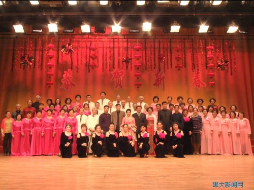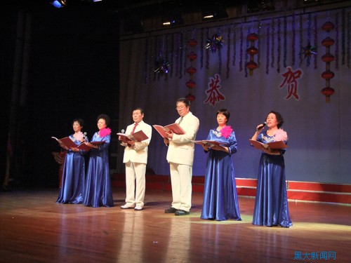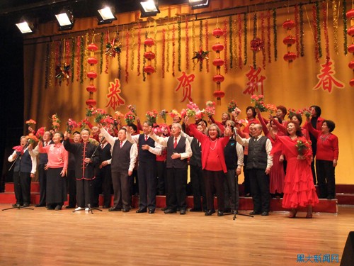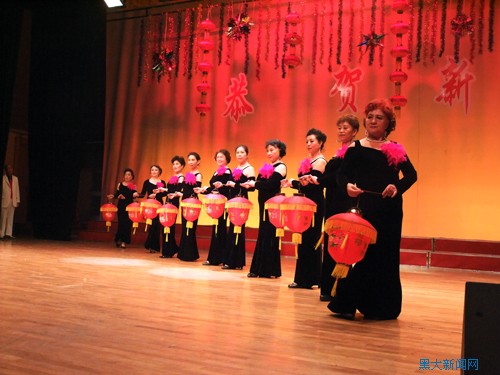 祖国繁花似锦,我们纵情歌唱,一首俄文大合唱《在那白茫茫的田野上》,点亮了在场老同志欢乐的情怀;欢快淳美的舞蹈伴着《卖货郎》美妙的歌声,带领大家走进那纯美的爱情故事;由刘冰等老同志带来的诗朗诵《2011年新年献词》更是表达了老同志们对黑大、对祖国的深深热爱与眷恋。
