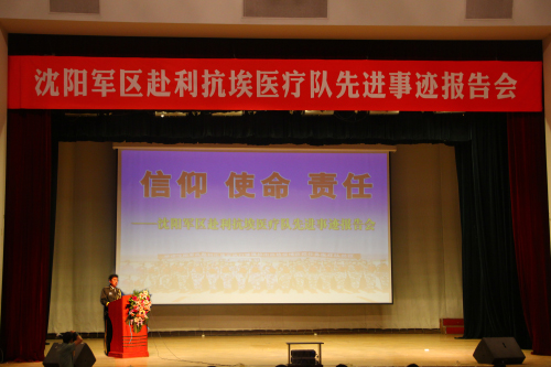 6月18日下午,沈阳军区赴利比里亚抗埃医疗队先进事迹报告会在我校音乐厅举行。来自沈阳军区总院、202医院、205医院的7位抗埃勇士为全校师生带来一场感人至深、催人奋进的“讲述”。在那片没有硝烟却异常凶险的战场上,中国军人凭借钢铁般的精神意志和无可比拟的忠勇大爱演绎信仰、使命、责任,阶段性实现了习近平主席提出的“打胜仗、零感染”目标,赢得了“令世界点赞的中国担当”。
