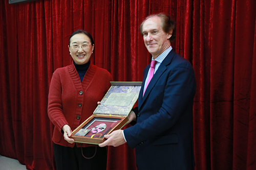 最后,何颖校长向古斯塔沃·马蒂诺大使赠送了礼物,并合影留念。(摄影:张悦婷)