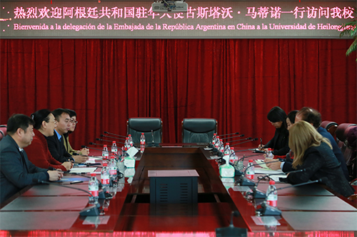 首先,何颖校长对古斯塔沃·马蒂诺大使一行的到访表示热烈欢迎,并简要介绍了学校的基本情况。她指出,黑龙江大学的前身是1941年成立的中国人民抗日军政大学第三分校俄文队,在70余年的办学历程中,学校不断强化俄语学科专业的优势地位和引领作用,与此同时,学校还十分重视外语教学与研究。她强调,学校将以此次大使来访为契机,进一步加强学校的国际文化交流与合作,并期待与阿根廷的大学建立文化、教学等方面的联系。