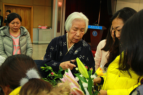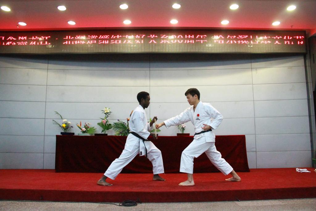 北海道大学国际合作机构特聘教授野泽俊敬先生介绍了关于北海道大学与中国的交流情况,以及北海道大学相关情况,并希望北海道和中国哈尔滨的友好关系继续发展。随后,来自日本空手道协会(JKA)西安支部沈阳道场的桐田一义先生和来自卢旺达的李斯先生为在场观众做空手道表演,精彩的表演赢得了在场观众的阵阵掌声。大连池坊同好会代表杉节子女士进行了花道展示,何颖校长及数名观众与杉节子女士友好互动,共同领略花道艺术之美。(摄影:徐速 孙嘉璐 黄淑宁 郑权)