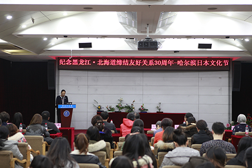 11月18日上午,纪念黑龙江·北海道缔结友好关系30周年——哈尔滨日本文化节在我校多功能厅举行。此次活动由日本驻沈阳总领事馆、北海道政府主办,黑龙江大学协办。日本驻沈阳总领事馆总领事石塚英树、黑龙江省外事办公室副主任杨鸿鹏、黑龙江省外事办公室领事处副处长徐速,我校校长何颖出席本次活动。本次活动由日本驻沈阳总领事馆领事菊地职一主持。