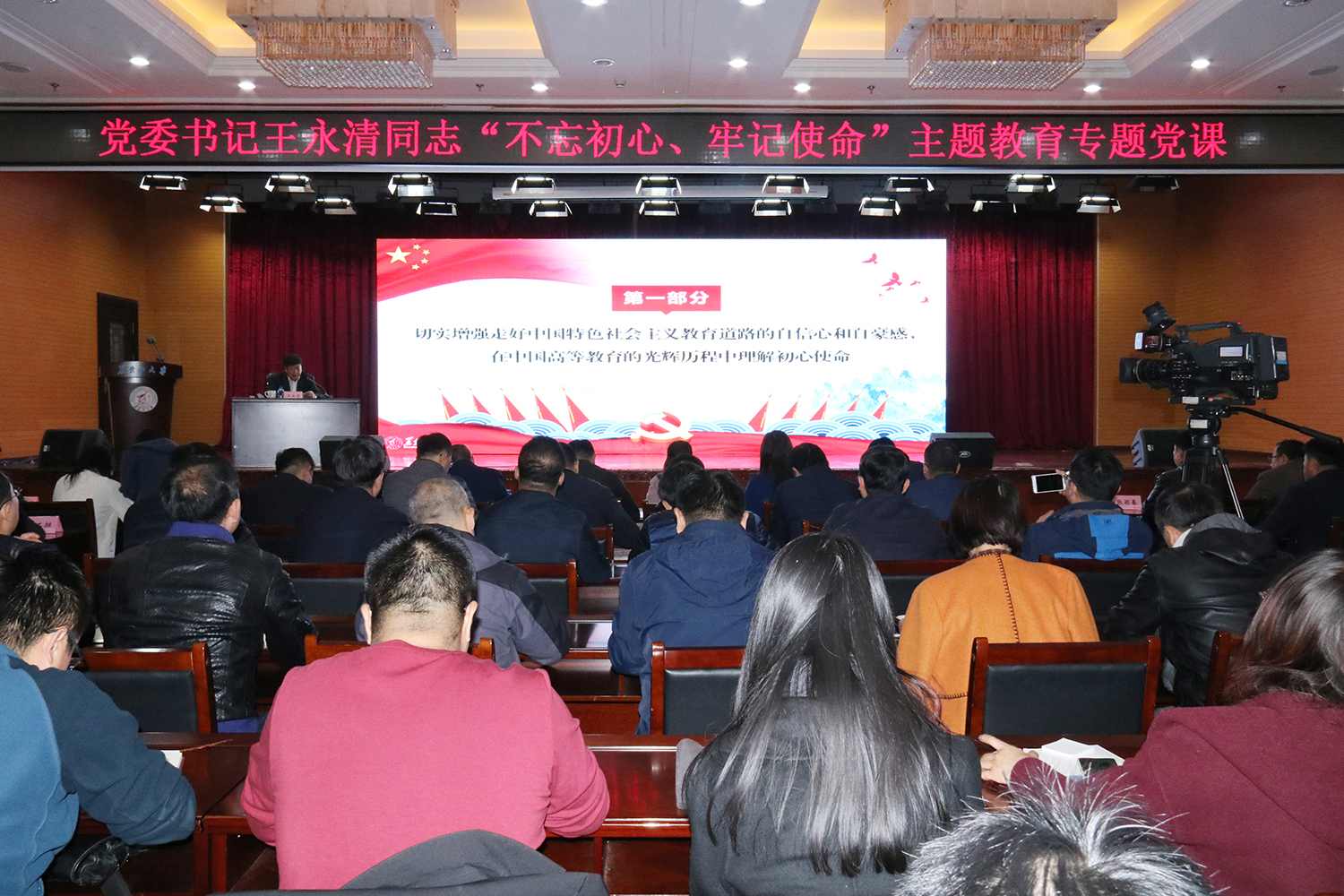 按照学校“不忘初心、牢记使命”主题教育的总体安排,10月17日上午,校党委书记、学校“不忘初心、牢记使命”主题教育领导小组组长王永清以“牢记党的初心使命、走好强校发展新路”为题,讲授了主题教育专题党课。他强调,要在全面深入学习领会贯彻习近平新时代中国特色社会主义思想特别是习近平总书记关于教育的重要论述中体会初心和使命,从教育在民族振兴、国家富强中的重要地位去认识初心和使命,在与习近平总书记系列重要讲话精神、党中央决策部署对标对表中校正初心和使命,坚持为党育人、为国育才,坚持立德树人、守正创新,努力办好党和人民满意的教育和高水平大学。