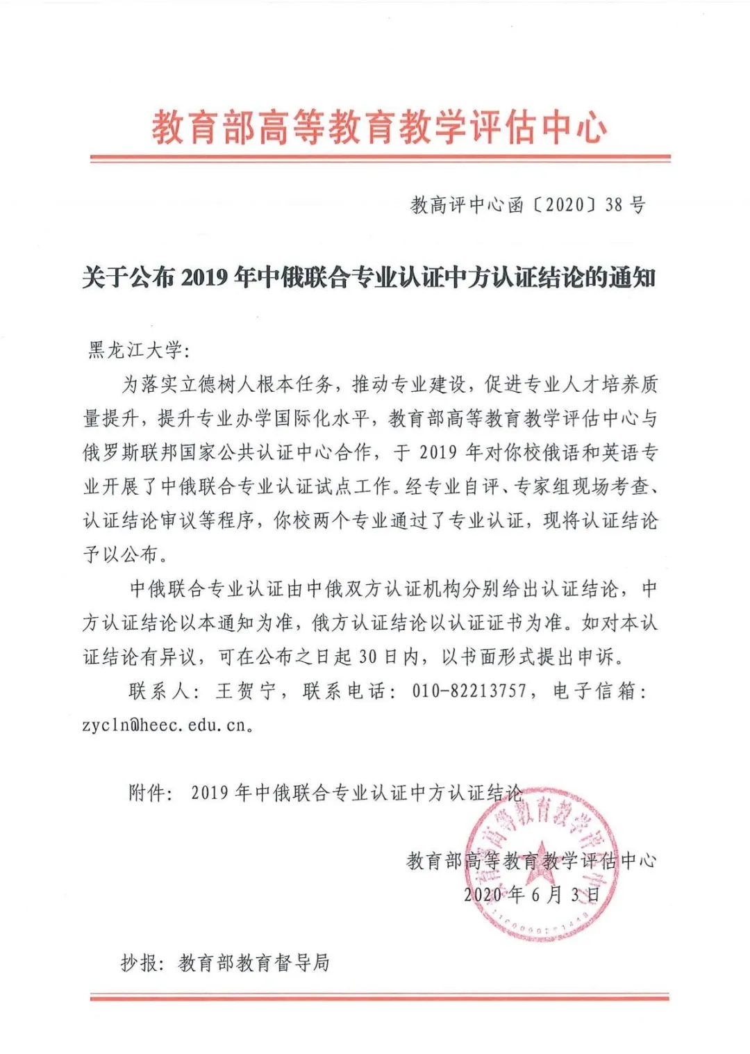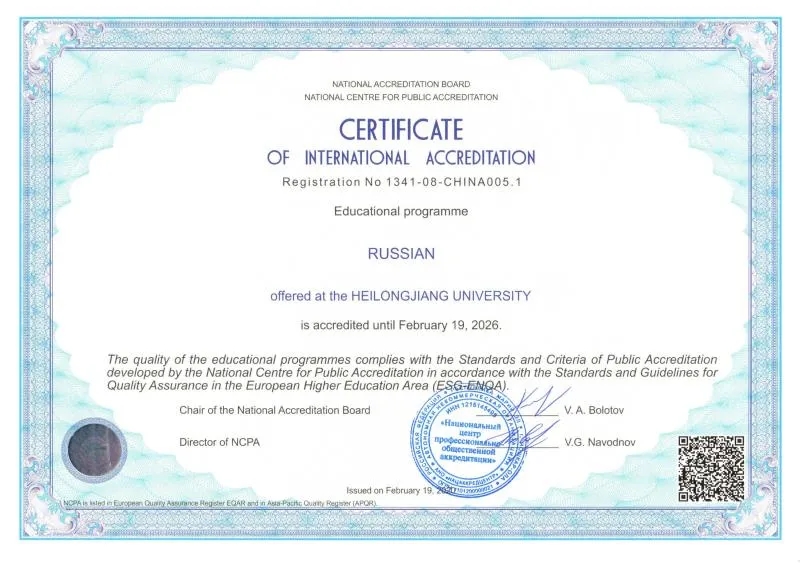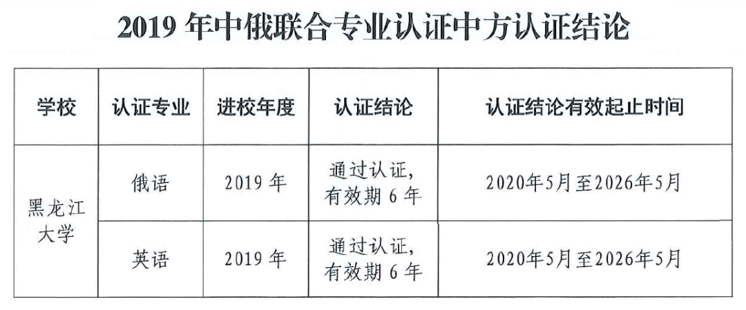 经过专业自评、专家组现场考察、认证结论审议等程序,2020年6月3日,教育部高等教育教学评估中心发布了《关于公布2019年中俄联合专业认证中方认证结论的通知》(教高评中心函〔2020〕38号),我校俄语和英语两个专业通过了专业认证。