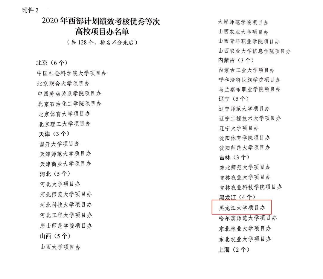 近日,全国大学生志愿服务西部计划项目管理办公室公布了2020年西部计划绩效考核优秀等次高校项目办名单,我校项目办荣获2020年西部计划绩效考核优秀等次高校项目办。全国共有128所高校获评“优秀项目办”,黑龙江省仅有四所高校获评该项荣誉。