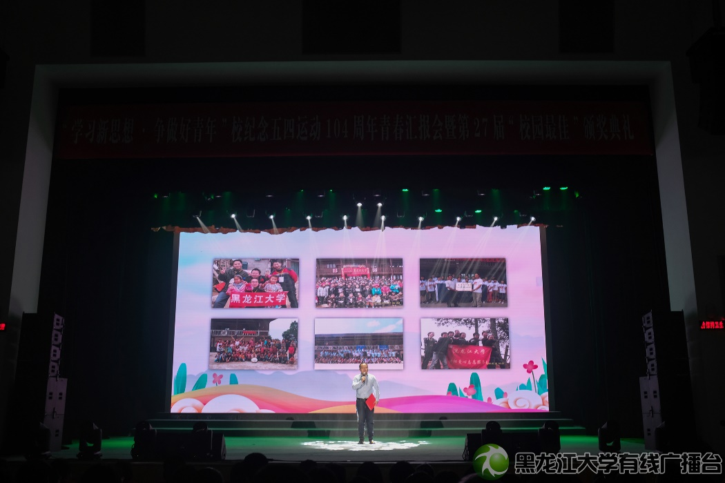 学习新思想,争做好青年,青春心向党,建功新时代。为深入学习宣传贯彻党的二十大精神,纪念五四运动104周年,引导广大青年听党话、跟党走,做有理想、敢担当、能吃苦、肯奋斗的新时代好青年,4月26日下午,我校在音乐厅举行“学习新思想 · 争做好青年”纪念五四运动104周年青春汇报会暨第27届“校园最佳”颁奖典礼。省委主题教育第十六巡回指导组、全体校领导、各职能部处负责人、各学院师生代表出席活动。本次活动通过黑龙江大学官方微信视频号进行同步直播。