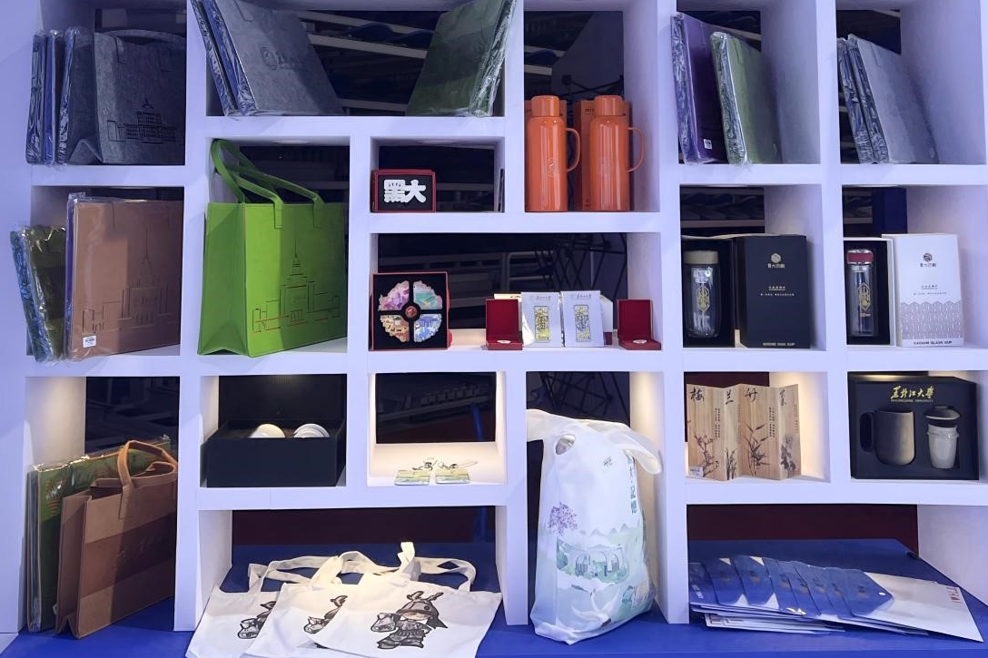 文创黑大:文化赋能点亮创意生活。资产经营公司与艺术学院联合呈现的文创板块,将黑大文化符号转化为可触摸的艺术体验。博古架上陈列着校园系列主题文创,五大连池火山岩与宜兴紫砂混合制成的紫砂系列产品,充满黑大元素的纸雕灯、纸雕本,龙小博、黑大主楼、校徽图案的红甜菜文创冰淇淋,铜镇纸、香薰炉、字母笔等学习用品,毛毡包、帆布包、初心水杯等日常用品,黑大的各种文创产品营造出精致时尚的氛围,每一件展品都承载着黑大的历史记忆与创新精神,让传统文化在现代设计中焕发新生。