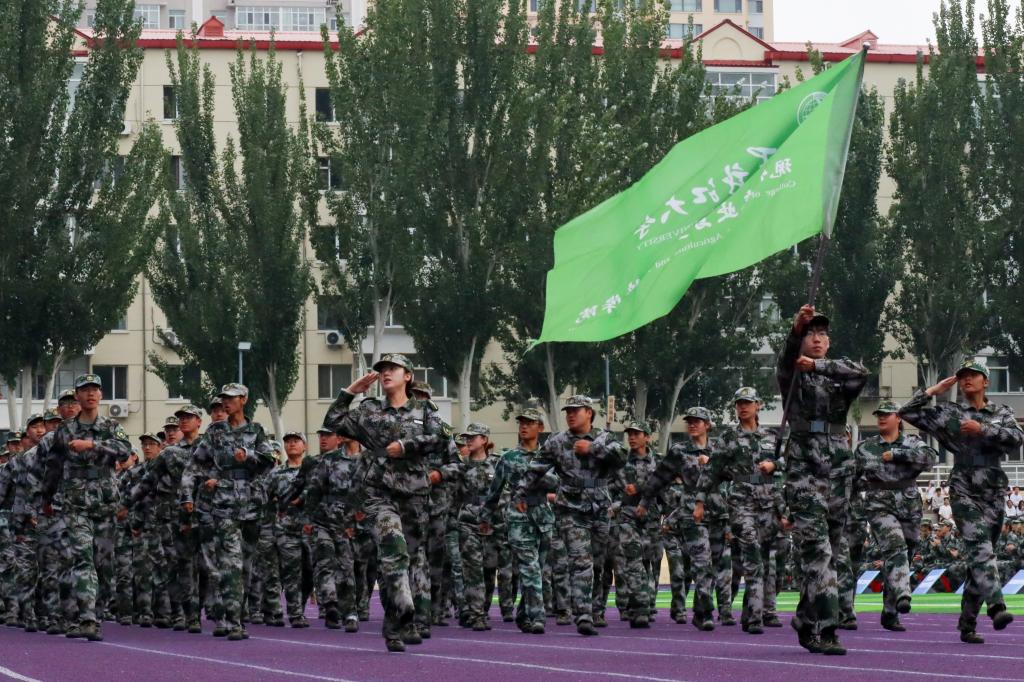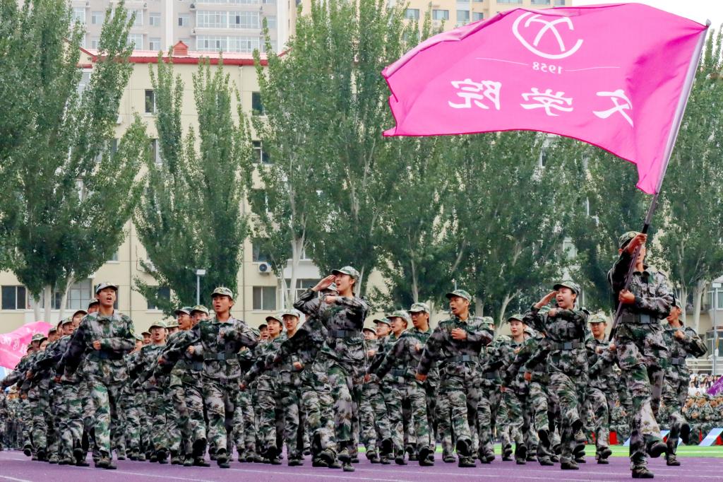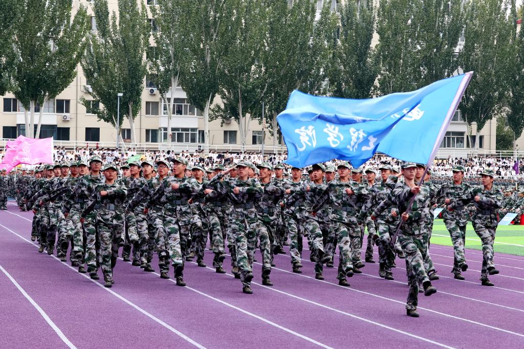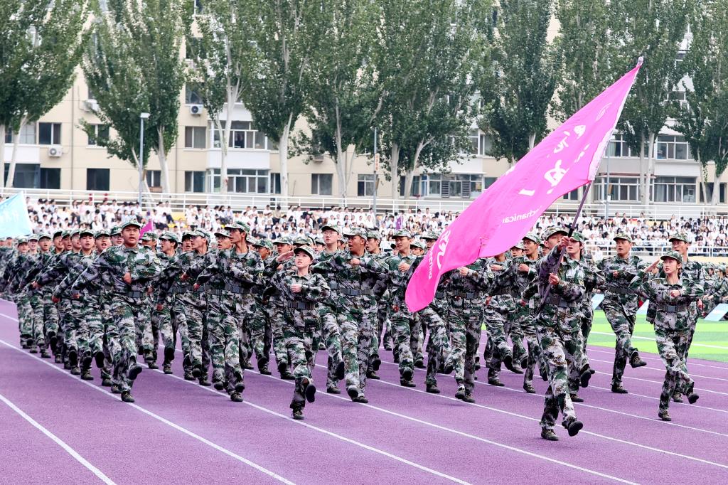 伴着激昂雄壮的乐曲,分列式正式开始。护旗手迈着整齐划一的正步,稳步走过主席台,受阅方阵精神抖擞、斗志昂扬,步伐坚定有力,口号高亢嘹亮,气势豪迈地依次通过主席台,充分彰显了军训的优良成果,展现出2025级新同学朝气蓬勃、昂扬向上的精神风采。
