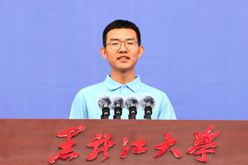 机电工程学院2025级电气工程及其自动化专业本科生汪飞扬代表新生发言。他向师长和父母表达感谢,并分享了入校以来迎新、集体生日会以及军训生活的暖心体验。他号召全体新生要以“博学慎思,参天尽物”的校训为引领,传承抗大精神、肩负使命担当、努力追逐梦想,共同书写新时代黑大青年的青春答卷。
