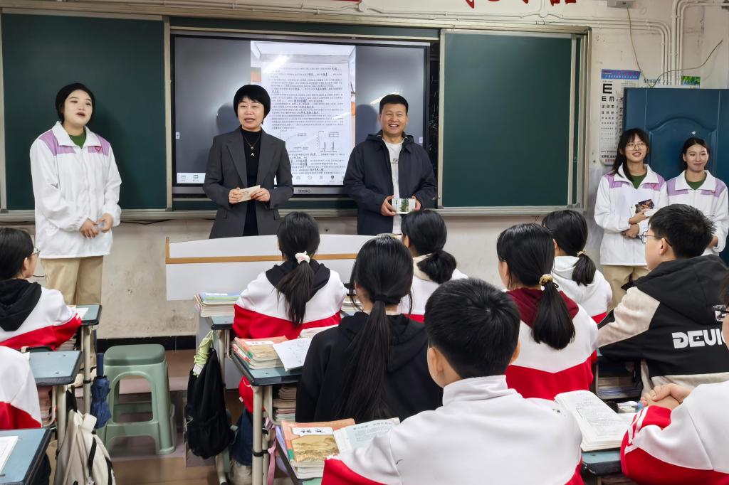 在潼南区双江镇初级中学,刘凤影一行深入校园,参观了解双江中学办学历史与特色展区,并与支教团成员深入交流,详细询问教学工作、生活保障及成长收获。在支教团授课班级,学生代表通过合唱黑龙江大学校歌《岁月如歌》、朗诵手写明信片、赠送感谢卡片表达对我校师生的敬意。随后,实地走访志愿者宿舍,了解日常住宿生活、课后备课情况,并送上毛毯等慰问品,传递学校的温暖关怀。刘凤影勉励支教团成员:“要以‘躬耕教坛’的初心扎根基层,用‘勤学笃行’的态度赋能成长,在乡村教育振兴中传承黑大精神、彰显黑大学子的使命担当。”