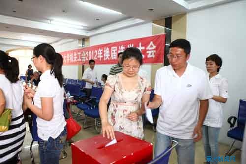 6月25日上午9时,我校2012年机关工会换届选举大会在禹志园综合楼会议室召开。校工会侯岳川,机关党委书记张宏,原机关工会主席、机关党委副书记曲少滨及上届机关工会委员、机关各部门工会组长和工会委员参加了会议。会议由原机关工会副主席、党委组织部副部长庞淑红主持。