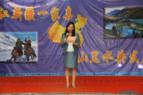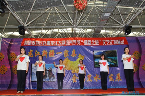 丁宏处长在演出开始前发表了热情洋溢的致辞。她表示,过去的一年里,黑龙江大学学工、教务、团委、后勤等相关部门积极行动起来,为落实党和政府的援疆政策,圆满完成对阿勒泰学员的培训任务,做了大量积极、热情、富有实效的工作。学校以提高培训质量为核心,以增强学员的综合竞争力为重点,集合全校最优秀的师资力量和教学资源,精心组织教学,严格执行培训计划要求,将第一期学员培养成为社会优秀急需人才和专业骨干。同时,她还表达了对南岗区人保局、安监局、文体局、行政设备科为学员们提供宝贵的实习机会的感谢之情。最后,她寄语即将奔赴工作岗位的第一期学员,希望他们常怀感恩之心,感恩祖国、感恩人民,努力学习、提高专业知识水平,锻炼实践能力,搞好民族团结,为家乡的发展和祖国的繁荣作出更大的贡献;同时她也鼓励第二期学员以第一期学员为榜样,珍惜学习的机会,努力提高自己的能力。
