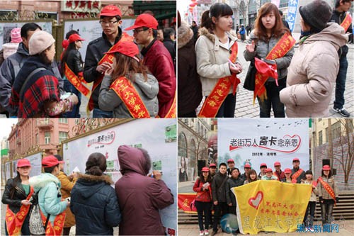 3月31日上午9时,黑龙江大学青年志愿者协会志愿服务队来到中央大街,与市民们一同参加了“老街万人寄卡念亲恩”活动。
