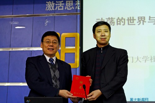 党委副书记曲科军教授、校友总会常务副会长钟庆杰教授、机关党委、政府管理学院、国际文化教育学院等相关学院师生参加了讲座。讲座前钟庆杰教授介绍了校友总会创办黑龙江大学“校友讲坛”的意义,他指出“校友讲坛”搭建了在校师生与校友交流、接触的平台,是学校开展校友工作,发掘校友潜力,拓宽校友服务母校的载体。定期把杰出校友请回学校,用校友丰富的人生阅历、成功的创业经验,帮助学生更好地“做人、做事、做学问”,充分发挥校友对在校学生的引导和示范作用。受张政文校长的委托,曲科军副书记为郝雨凡校友颁发了黑龙江大学客座教授聘书。
