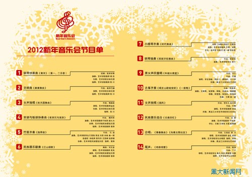 12月21日18时、12月22日15时30分,我校2012年新年音乐会将分为两场在音乐厅隆重举行。欢迎广大师生员工与我们欢聚一堂,用收获与祝福唱响欢歌,用华美与优雅歌颂幸福,用追求与梦想畅想明天,用奋斗与拚搏谱写华章!让我们手牵手同唱对祖国的深沉热爱,心连心奏响对黑大的美好祝福!