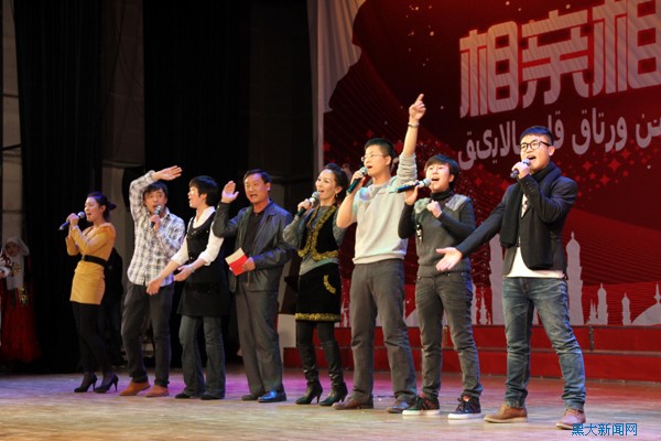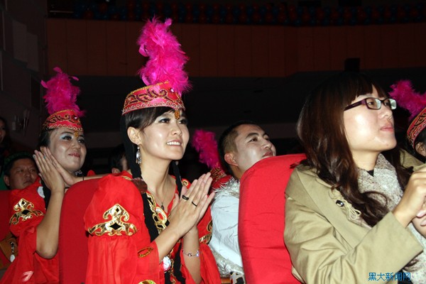其中,由新疆学员和黑大学子共同演绎的歌曲联唱掀起了演出的第一轮高潮,《美丽的家乡》、《黑大欢迎你》相得益彰,共谱民族大团结的动人赞歌;阿勒泰学员奉上的健美操《舞动的旋律》、我校街舞社团带来的震撼街舞表演让现场气氛迅速升温,虽然民族不同,但青年人特有的朝气和活力成为连通心灵的桥梁;新疆民族乐器冬不拉独奏《喜庆》、民族歌曲《你是我的玫瑰花》、舞蹈《恰秀》、《加尔加尔》则开启了通向辽阔天地和神奇之旅的大门,观众如同置身正在欢庆古尔邦节的新疆草原——洁白的毡房、成群的牛羊、姑娘飘扬的裙裾和小伙子热情的笑声……把节日的快乐、美好的祝福带到了黑大校园和龙江大地。