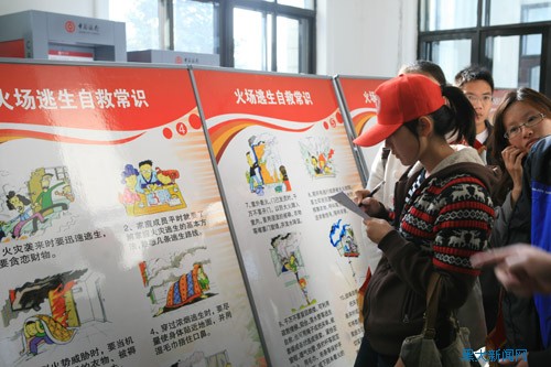11月9日,由我校安全保障部防火科主办的消防安全知识图板展示和消防器材展活动分别在主楼大厅、B区篮球场进行。