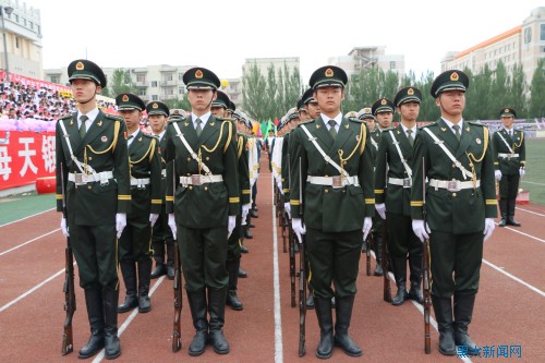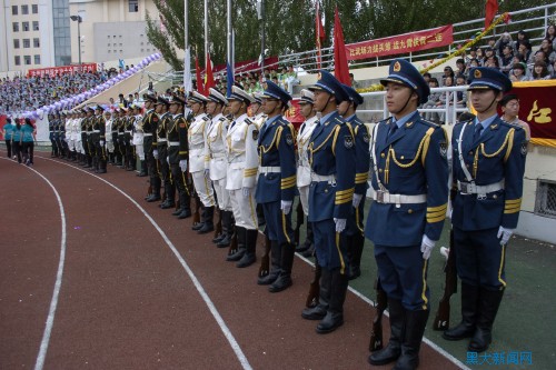 在5月29号的开幕式上,我校三军仪仗队作为运动会上最亮丽的一道风景第一个向主席台走来,他们身着天空蓝、浪花白、橄榄绿三色军装,英姿飒爽、步履铿锵,彰显着新一代国防生的豪情万丈。