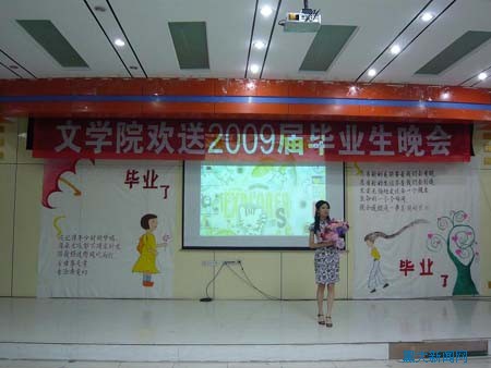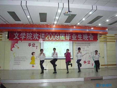 晚会开始前,现场已是座无虚席。晚会不仅吸引了即将毕业的大四学生前来观看,许多低年级的同学们也来到现场,为学长们送行。一段极富青春活力的舞蹈拉开了整场晚会的序幕,演员们身着学士服,头戴学士帽,精彩地演绎着毕业生的故事。在随后的视频短片中,一张张校园的照片,一个个熟悉的名字,从校门到讲堂,每一个角落里都埋藏着同学们挥之不去的记忆。由05级汉语言四班高健等同学带来的乐队伴唱《hey jude》,美妙的旋律中展现了他们不俗的才华和唱功。05级朱璇、徐璐带来的毕业感言“别了同学,别了老师,别了文学院,别了大学”,以其强烈真挚的情感博得了场下同学持续热烈的掌声。05级的徐雪娇同学的诗朗诵《当你老了》和《念奴娇赤壁怀古》用两种不同的诗风展示着她的多才多艺,也为同学们带来听觉上的享受。而由徐术坡同学带来的毕业感言,使现场紧紧被感动与不舍包围着。低年级的同学们也为此次晚会精心准备了节目,用歌曲和舞蹈表达对学长们的不舍与祝福。其中,崔晨、陈海宽等人献上的歌曲联唱《一个是夏天一个是秋天》和《第一时间》,翟鸿艺的独唱《爱的箴言》以及张悦同学的古典舞《春江花月夜》都用甜美的歌喉和曼妙的舞姿展现着同学们的活力,也寄托着对大四学长们真诚的祝福。小品《落地为