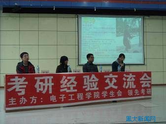 就业难题显而易见,考研大潮百舸争流。黑龙江大学电子工程学院考研经验交流系列活动之“研者之声”讲座于4月8日晚6点在大学生活动中心多功能厅举行。