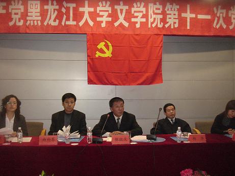 中国共产党黑地龙江大学文学院第十一次党员大会,于2007年12月26日下午在外事处多功能厅胜利召开。会议在热烈而严肃的气氛中进行,黑龙江大学党委副书记、校长张政文同志,校党委组织部部长曲科军同志及全院107名党员参加大会。
