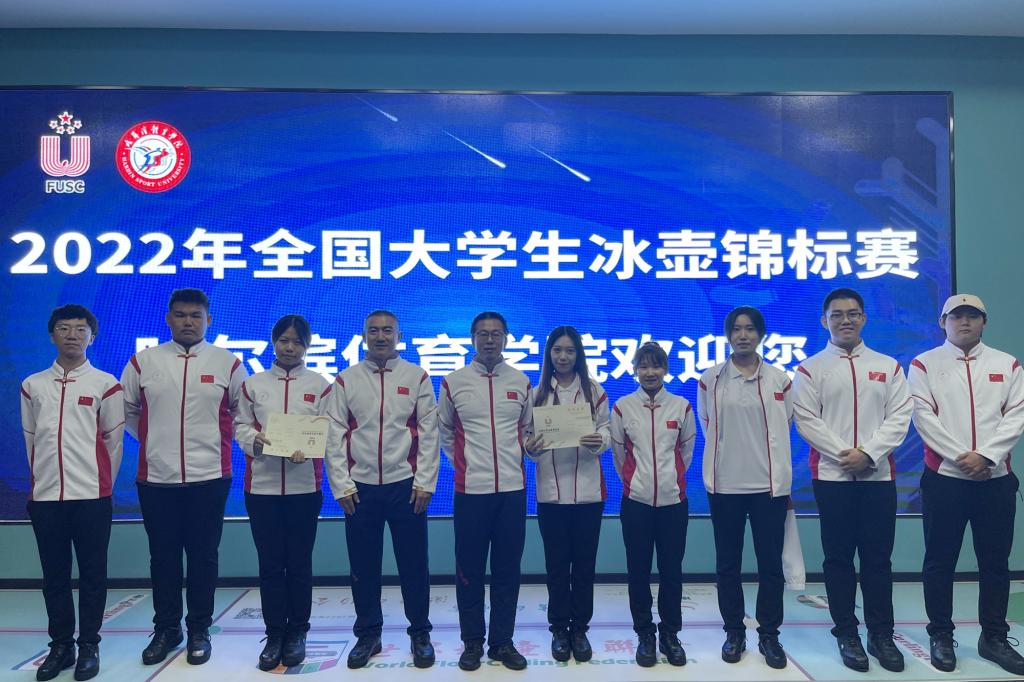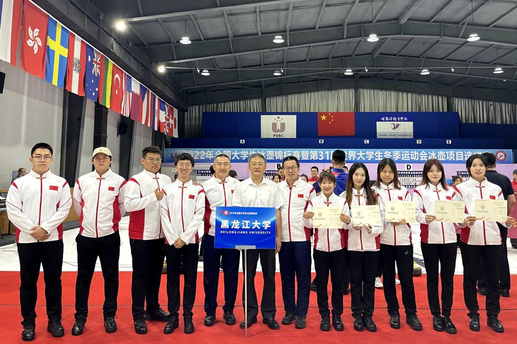 黑龙江大学冰壶队由体育教学研究部主任杨颂担任领队,国梁老师担任教练,经过四天的激烈角逐,最终,黑龙江大学女子冰壶队取得了第八名的好成绩。体育教学研究部牛晓暹老师担任本次赛会的裁判长,并获得“最佳裁判员”荣誉称号。